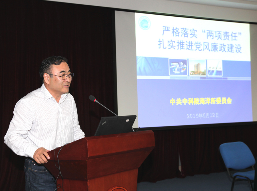 会议首先由杨红生副书记代表党纪委班子作了题为《严格落实“两项责任”,扎实推进党风廉政建设》的专题报告。报告全面传达了中央纪委驻中科院纪检组组长李志刚在全院党支部书记轮训会议上的廉政报告精神,系统回顾了海洋研究所2014年廉政工作,对2015年党风廉政工作进行了部署。近年来,海洋所严格落实党委和纪委“两项责任”,结合中心工作,围绕作风建设长效机制和院巡视组反馈意见整改落实,从强化制度落实入手,以风险防控为切入点,重点加强惩防、内控、队伍、宣教和廉政文化五大体系建设,取得了较好成效,全年无违法违规违纪案件发生,促进了科研工作平稳健康发展,