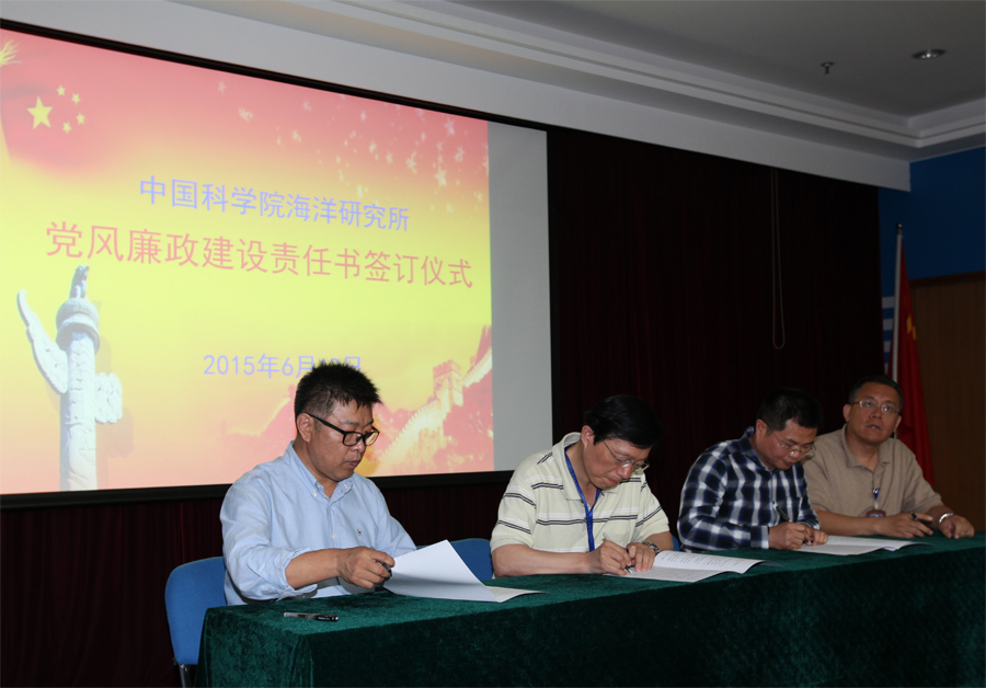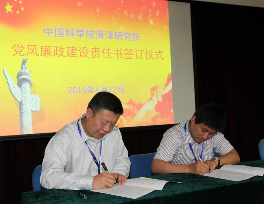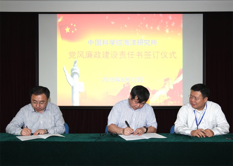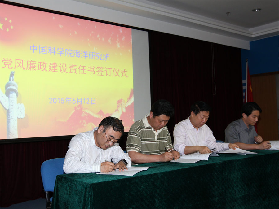 6月12日上午,海洋研究所举行了党风廉政建设责任书签订仪式。所长孙松;党委书记兼副所长王凡;副所长李铁刚;党委副书记、副所长兼纪委书记杨红生;副所长王辉出席仪式。所长助理、党委委员、纪委委员、研究室正副主任、管理和支撑体系负责人共50余人参加了签字仪式。仪式由纪委书记杨红生主持。