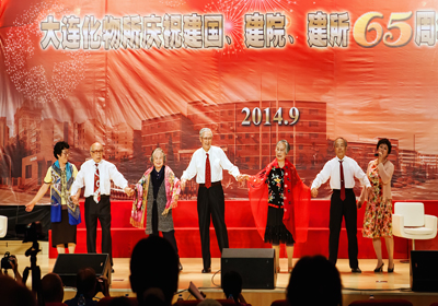 整个联欢会过程中,观众们沉浸在一片兴奋与激动的海洋中,欢乐祥和的气氛一浪高过一浪,送给台上演员的掌声一阵高过一阵——由《所志》编写组创作,所咨询委12位委员深情演绎的配乐诗朗诵《献给建所65周年》,完整地回顾了大连化物所走过的65年的光辉历程,由衷地倾诉了老一辈化物所人对研究所的热爱与忠诚;由平均年龄75岁的石油大学校友会20位老同学们合唱的《我为祖国献石油》,款款地唱出了老同学们当年为祖国科研事业贡献青春力量的无悔与豪迈;由平均年龄82岁的3对老夫妻手牵手献上的歌伴走台秀《最浪漫的事》,掀起了观众们尘封的青春记忆,触动了在场每一位化物所人柔软的心灵;在《异地老同志问候视频》中,观众们看到了久违的当年一起奋斗的老同事那熟悉又亲切的面庞,听到了他们发自内心的对祖国、院里和所里的真心祝福和对所里人的真诚问候。整台晚会近200名演员,通过女声组合《今天是你的生日,中国》、男声四重唱《父亲的草原母亲的河》、舞蹈《红旗颂》、《小苹果》、《吉祥谣》、朗诵《中国梦、我的梦》、器乐合奏《我和我的祖国》、《好日子》、合唱《龙的传人》、《共和国之恋》等节目为庆祝65周年齐声喝彩,大家用各自不同的方式表达对祖国、对中科院、对化物所的热爱和祝福。