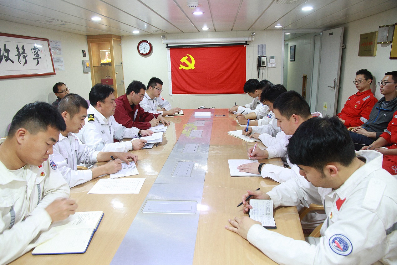 李雷溪同志宣读了《新形势下科学考察船运管中心党支部基层党建工作方案》,重点强调了临时党支部要严格落实“三会一课”、民主评议党员、组织生活会等基本制度,推进“两学一做”学习教育常态化,把理论学习与科考工作紧密结合,把党建工作的成效体现在服务科研、凝聚人心、帮助群众和培养人才上。会议围绕如何做好临时党支部党建工作及开展主题党日进行了广泛讨论和意见征集,并启动“戴党徽亮身份”活动,要求执行航次任务期间每名党员佩戴党徽亮党员身份,接受群众监督,树立光辉形象,争当耕海先锋,为“海上堡垒”添砖加瓦,为海洋科考保驾护航。