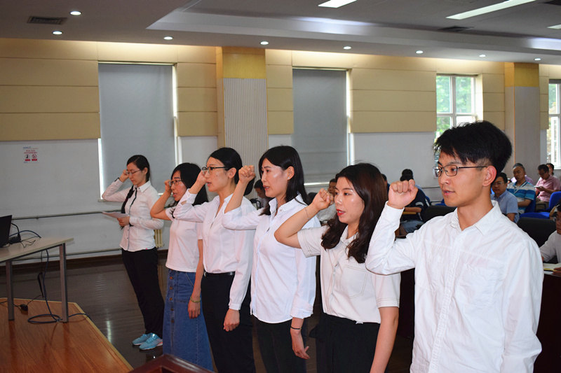 5名新入党预备党员面向党旗进行了庄严的入党宣誓仪式,全体党员在这神圣的仪式过程中集体重温了入党誓词。