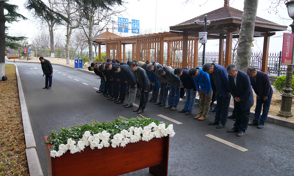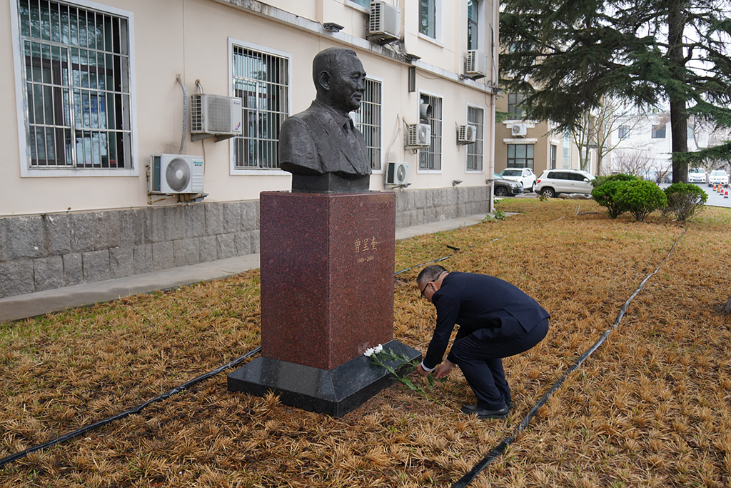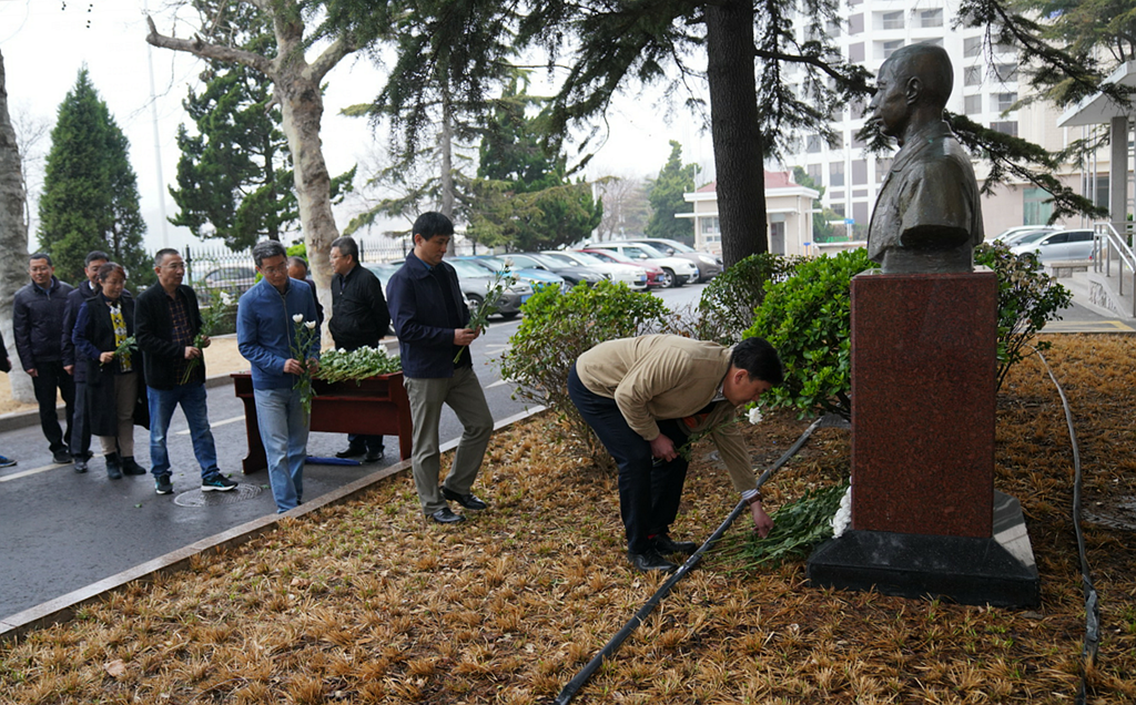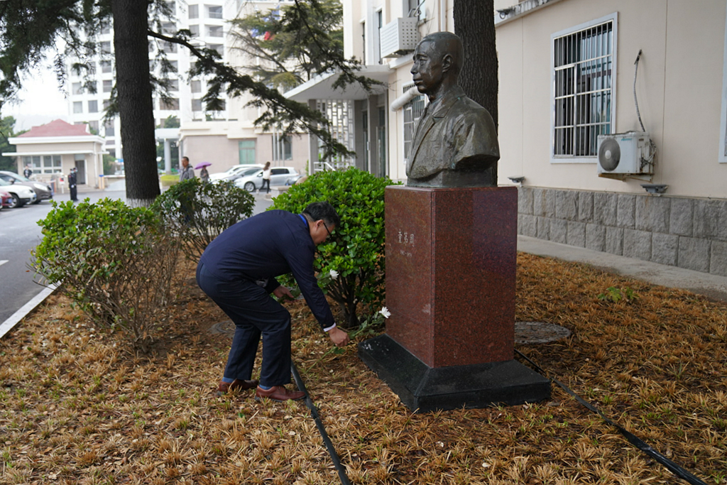 大家在童第周、曾呈奎两位科研先驱铜像前静默鞠躬,并依次上前敬献鲜花,表达对先辈的缅怀与敬重。