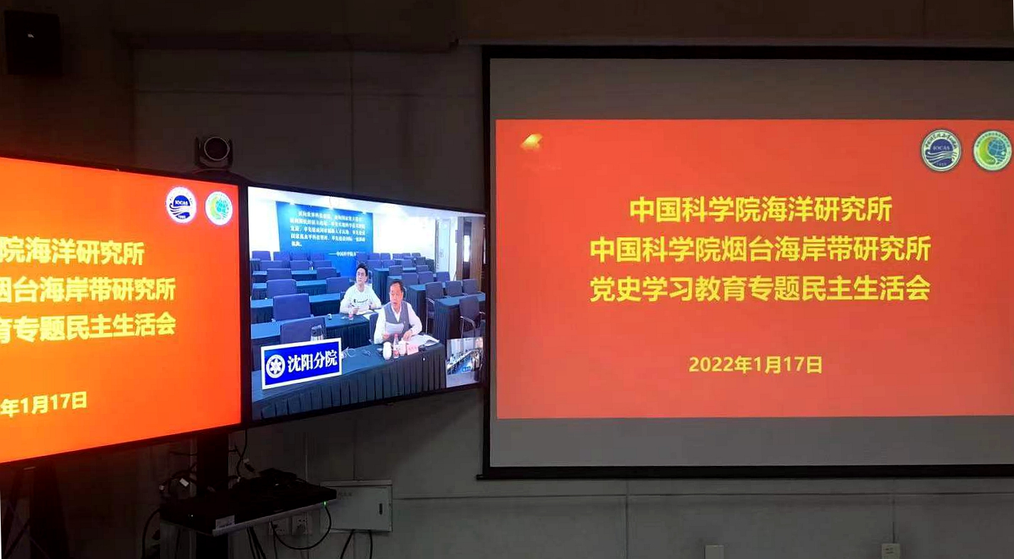 1月17日下午,中科院海洋所、烟台海岸带所联合召开党史学习教育专题民主生活会。中科院党史学习教育第十三指导组因新冠疫情防控原因以视频会议形式参会指导。两所领导班子全体成员参加会议,海洋所党委书记王辉主持会议。
