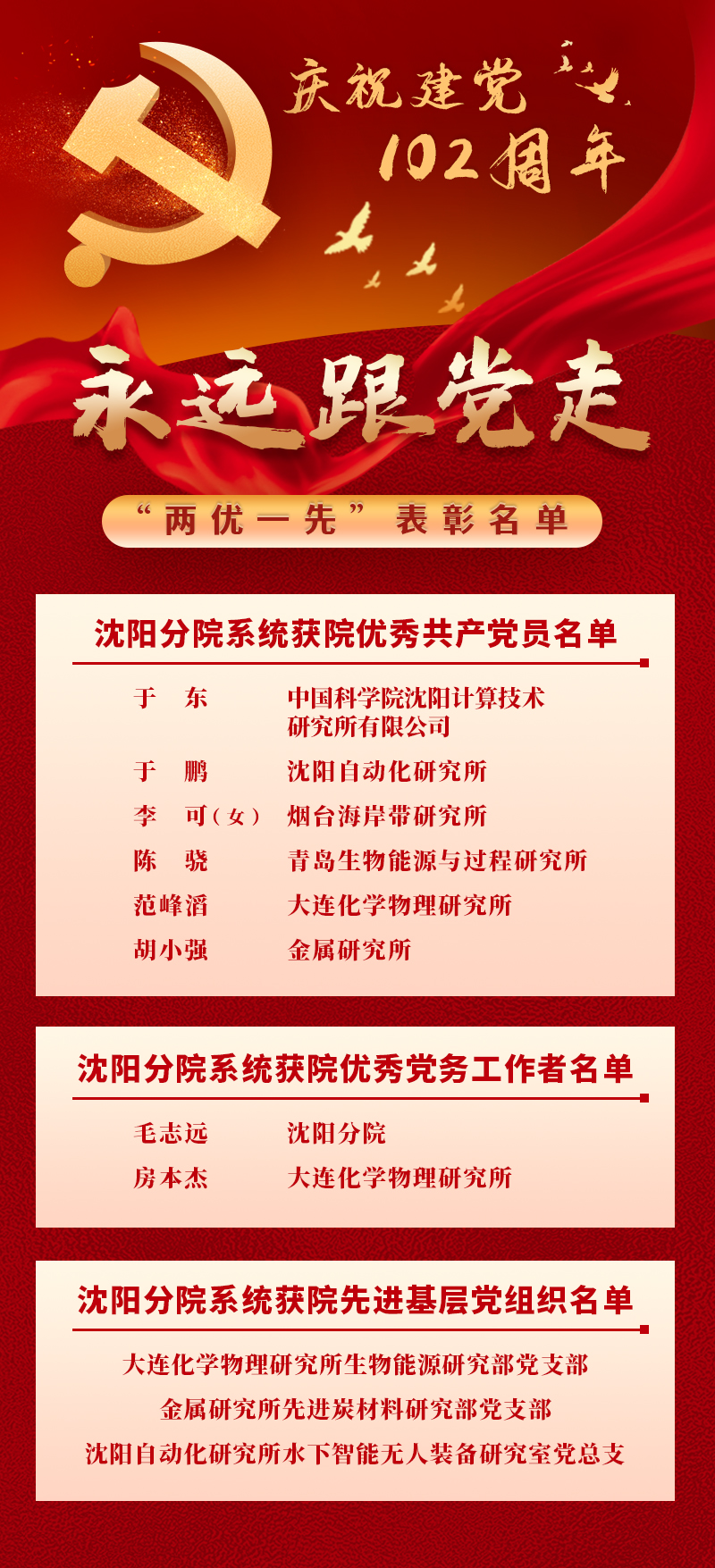 在庆祝中国共产党成立102周年,深入开展学习贯彻习近平新时代中国特色社会主义思想主题教育之际,为表彰先进、树立典型,6月20日,中国科学院召开党的建设工作会议,会上宣读了中国科学院“两优一先”表彰决定,沈阳分院系统于东等6名同志被授予“优秀共产党员”荣誉称号,毛志远等2名同志被授予“优秀党务工作者”荣誉称号,大连化学物理研究所生物能源研究部党支部等3个基层党组织被授予“先进基层党组织”荣誉称号。