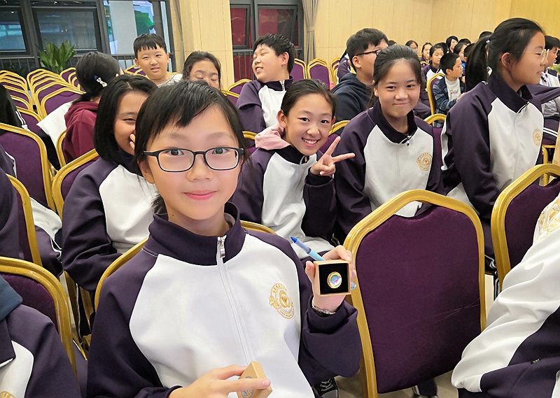 博士实践团做科普报告 学生展示回答问题获得的“科学”号纪念章