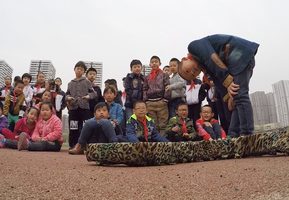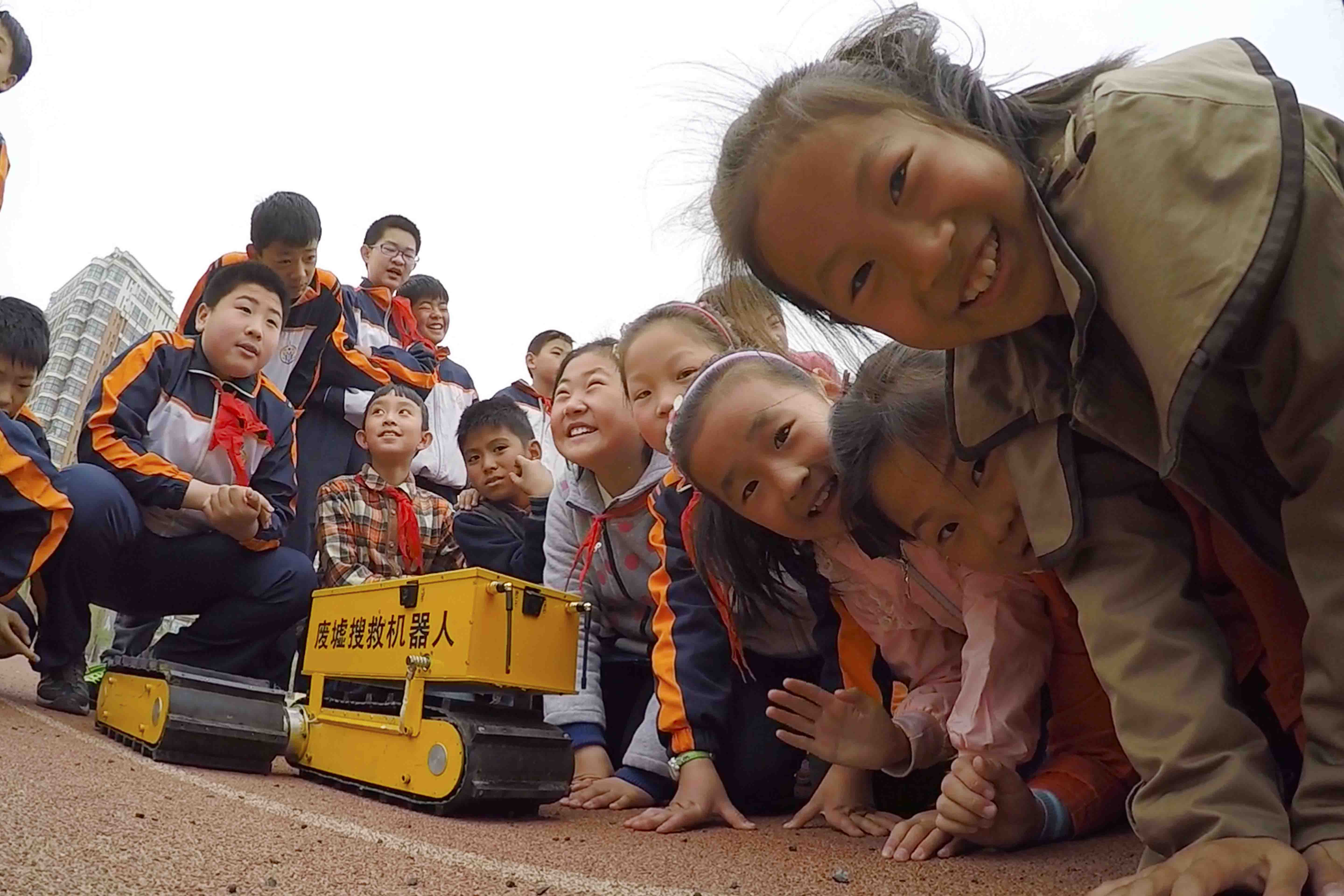 下课铃声响起后,孩子们来到操场,早有两台机器人等在那里——曾经参加过2013年四川芦山地震救援的废墟可变形搜救机器人和一台蛇形仿生机器人。