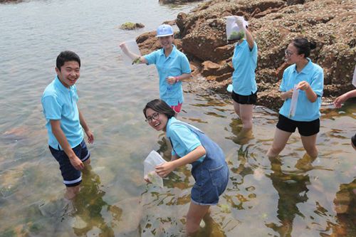 营员潮间带采集海洋藻类 老师现场讲解藻类标本制作方法