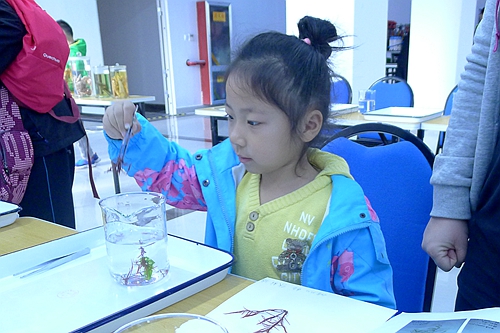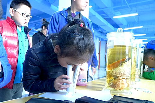 由海洋所组织的“蓝色海洋嘉年华”板块主要包括海洋生物标本展示区、微观世界探秘区、海洋科学实验区,吸引了大量学生及家长前来参观体验。其中,最吸引同学们的是可以亲自动手参与的海洋科学小实验。博士实践团的志愿者们随时为同学们提供指导,让同学们在安全规范的操作下,亲手参与制作藻类标本、大象牙膏、海底火山、海水捞盐、笔帽潜水艇等科学小实验,还可通过显微镜观察线虫、放射虫等玻片标本,探索神秘的海洋世界。大家十分高兴的是可以将亲手制作的藻类标本塑封带走,留作纪念。“我们专门奔着你们的科学小实验来的,孩子特别喜欢这些能自己动手操作的小实验,既能锻炼孩子的动手能力,又能让孩子学到科学知识”。一位学生家长这样说。