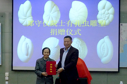 有孔虫是一种带壳的海生单细胞动物,距今历史达5亿年,种类繁多、个体微小、形态美丽,可广泛应用于地球科学、环境科学等领域的研究,被称为“大海里的小巨人”。郑守仪是国际著名的有孔虫研究专家,在中科院海洋所开创并发展了我国现代有孔虫研究,从事中国各海域现代有孔虫的分类及生态研究60多年,获得国际有孔虫研究最高奖“库什曼奖”。有孔虫体积微小,需借助放大镜才能分辨,为了让普通人欣赏到微观世界的美,郑守仪院士开创了世界罕见的有孔虫属种放大模型制作专案,使有孔虫这类海洋原生动物成为了人们看得见摸得着的科研教具、科普展品、旅游纪念品和大型雕塑。