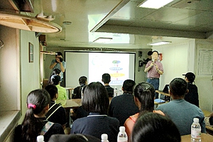 室内活动结束后,中科院海洋所曹西华研究员在“科学三号”后甲板为同学们讲解了先进的改性粘土喷洒设备,并进行了改性粘土现场喷洒作业演示。