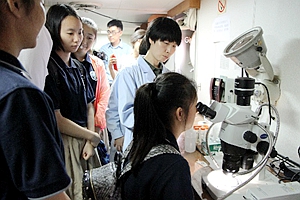 当天上午十时左右,主讲人俞志明研究员为同学们讲解了有害藻华的基本知识,包括藻华生物的多样性、有害藻华的形成原因和危害,以及有害藻华的防控方法和应急消除的成功应用案例等,并介绍了几种海洋环保的小妙招,鼓励同学们积极加入到海洋环保的队伍中来。之后,中科院海洋所宋秀贤研究员带领同学们体验、观摩了常见藻华生物的显微观察和几种典型有害藻华的治理实验,使同学们更加直观的认识了改性粘土对有害藻华的去除作用。面对显微镜下形态各异的藻华生物、直观的絮凝去除实验现象,学生们跃跃欲试、踊跃提问,科研人员耐心细致的一一作答,现场气氛十分活跃。