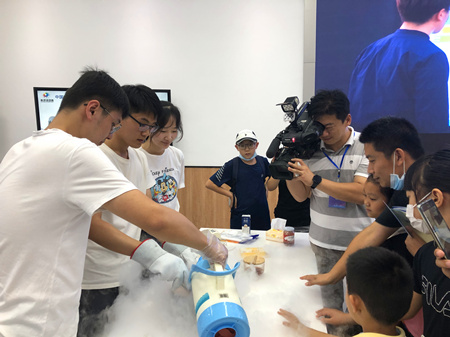 在青岛科技活动周开幕式上,我所博士研究生李庆林、车欣鹏、姜虹竹通过现场演示和视频讲解,为公众揭开网红液氮冰淇淋的秘密,只需几分钟时间,白色雾气升腾弥漫,自带特效的网红冰淇淋就完成了,现场小朋友们争相品尝,受到热烈欢迎。