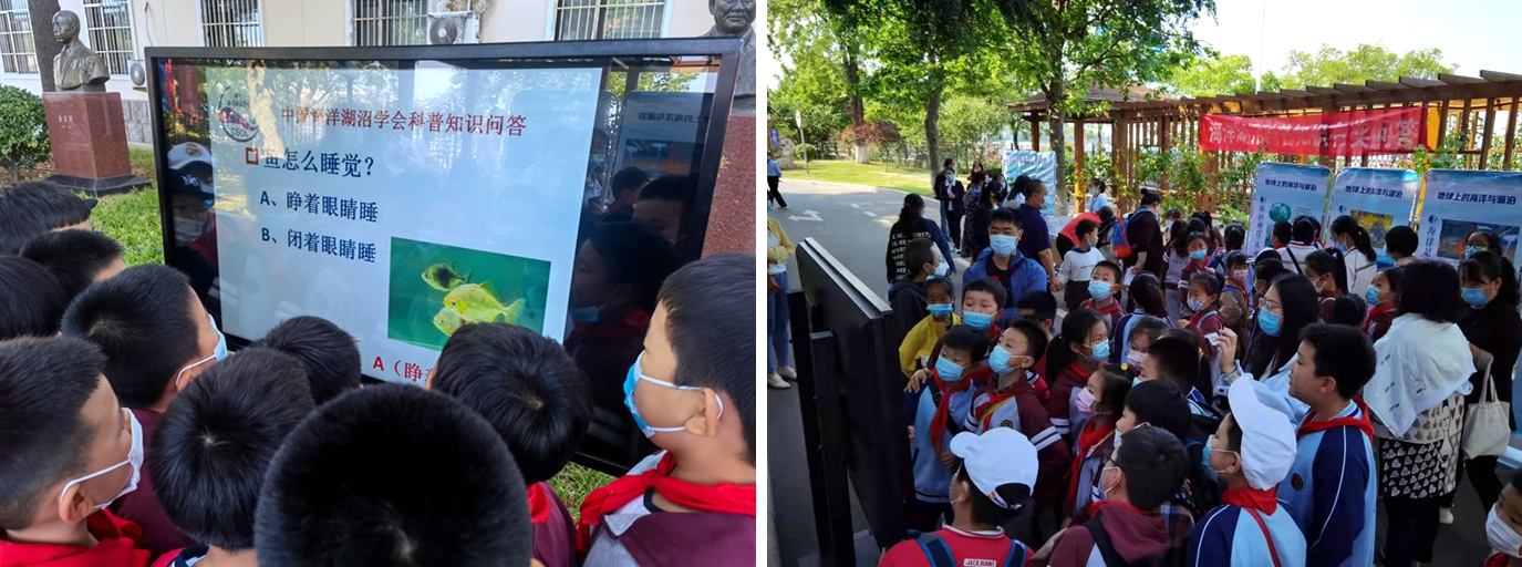 在海洋湖沼知识有奖问答环节,围满了参加活动的孩子和家长。你问我答,在与工作人员的互动中,同学们学习了海洋湖沼知识,也增进了公众及青少年学习海洋知识的热情。