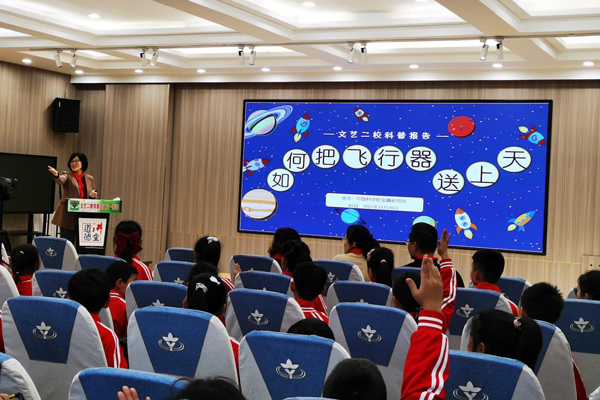在文艺二校,张洁研究员为同学们作了题为《如何把飞行器送上天》的科普报告。张老师从飞行物、飞行器,再到飞机、火箭如何上天,做了浅显易懂、生动活泼的讲解。并利用吹足气的气球进行猜想运动轨迹,通过观察找到答案,从而引出牛顿第三定律。将生僻难懂的科学理论化作通俗易懂的科普知识娓娓道来,激发了孩子们从小爱科学、学科学的热情。