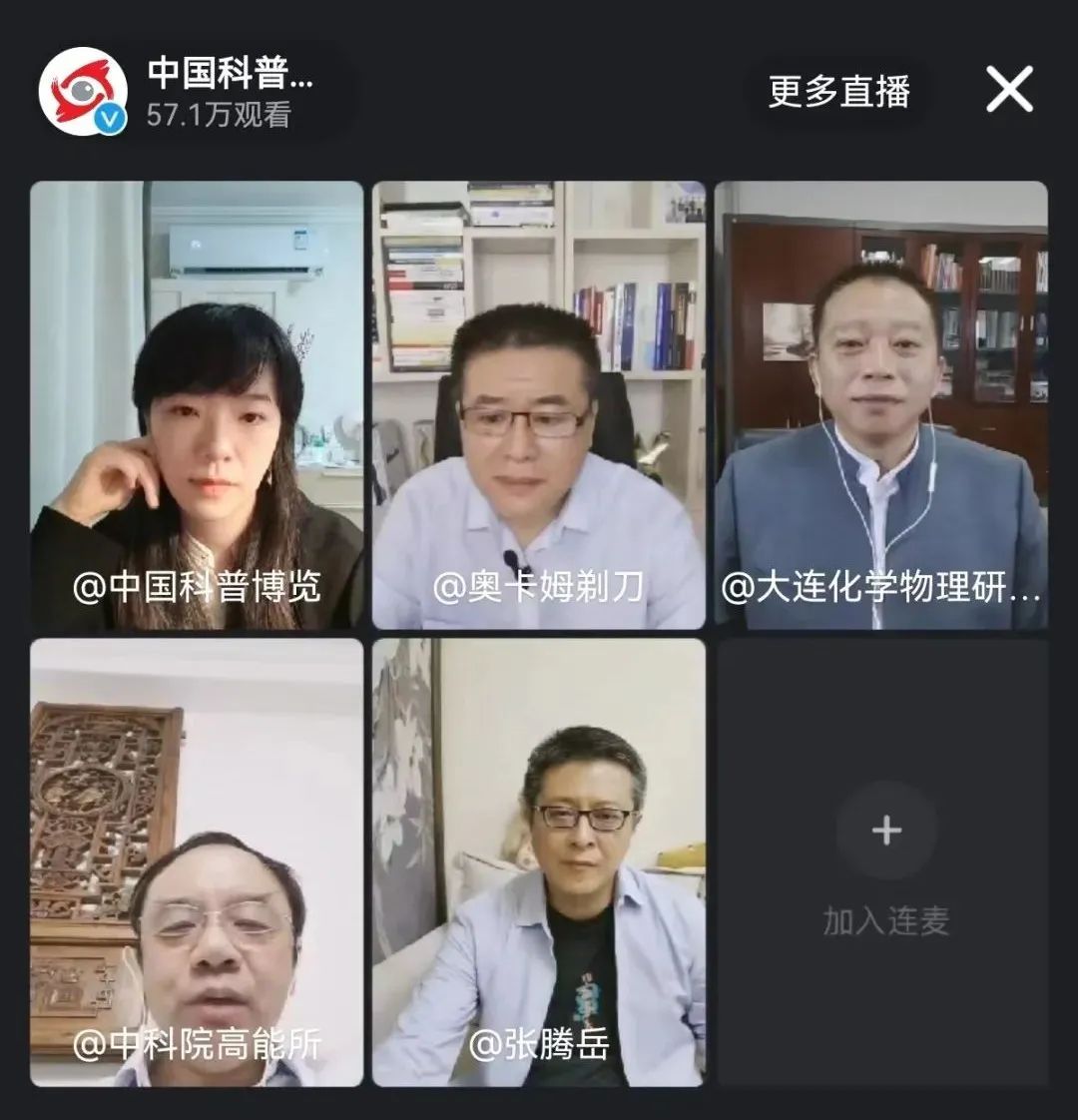 5月21日,大连化物所公众科学日在“云”上举行。在“云游化物所”环节中,主播们带领公众学习了中科院“基础研究十条”,全方位云游所展馆,了解大连化物所的研究成果,探寻科学背后的故事。在“科学实验秀”环节中,《可乐“大爆炸”》、《消失的颜色》、《流动的电池》一个个神奇的科学“魔术”,深入浅出地解释其中蕴含的科学道理。当晚,由中科院公众科学日和中国科普博览特别策划的“今夜,我们关心科学”大咖连麦畅聊环节中,大连化物所刘中民院士、高能所王贻芳院士、央视主持人张腾岳、知名科普博主奥卡姆剃刀共同参与聊聊关于科学的那些事,一个半小时的对谈,吸引了几十万名网友观看,为公众带来更多的科学思考和乐趣。