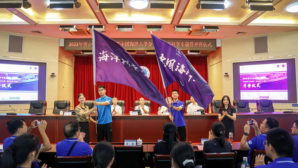 中国科学院海洋研究所综合管理处副处长王敏、中国海洋大学科学技术处副处长宋欣共同为海洋科学专题营、中国海洋大学分营营员代表授旗。