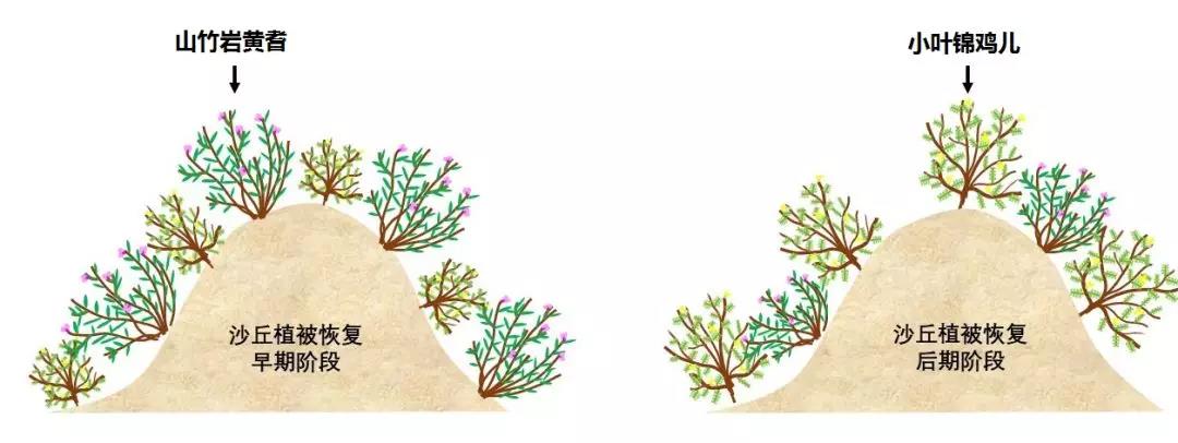 在早期阶段,山竹岩黄耆生长快速,可作为固沙先锋灌木起到迅速限制沙丘流动的作用。但随着沙丘逐渐固定和土壤水分的下降,该灌木的生长和存活逐渐受到限制,其优势地位被更为耐旱的小叶锦鸡儿所取代。
