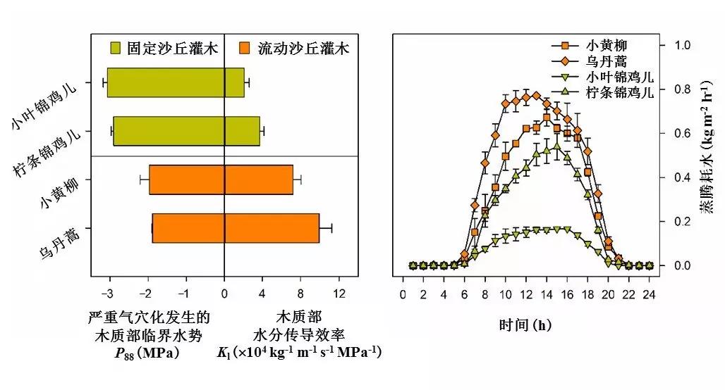 而在土壤水分条件较差的恢复后期阶段,固定沙丘上占据优势的灌木种采取“保守型”的水分利用策略,具有较低的水分传输效率但更高的木质部气穴化抵抗力,因此得以在固定沙丘上长期稳定存活。