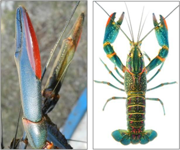左图为澳洲实地考察的红螯螯虾,右图为相同生长环境下红螯螯虾两种体色的对比,其颜色与性别无关。(图片来源:作者提供)