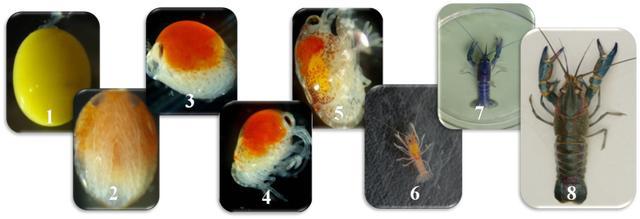 图为红螯螯虾的胚胎发育过程,1:受精卵;2:复眼色素形成期;3:脱膜前期;4、第一次脱膜后的小虾;5、第二次脱膜后的小虾;6、尾扇张开可以自由活动的红螯螯虾;7、体色明显且通过螯可以区分雌雄的红螯螯虾;8、成年红螯螯虾。(图片来源:作者提供)