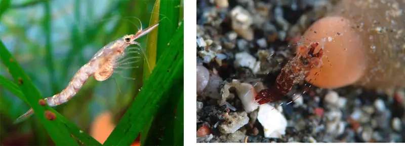 依附于海草的糠虾(左)和与海葵共生生活的糠虾(右)