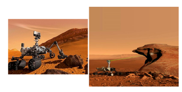 LIBS技术在地外探测中,最具影响力的是火星探测。于2011年11月发射,2012年8月成功登陆火星的“好奇者”号火星车主要采用了LIBS技术。科学家们将LIBS的激光发射与光谱采集装置集成在火星车的“头部”,在进行物质探测时,只需要发射一束激光束,就可以根据在目标物质表面产生的等离子体发射光谱来对目标物质成分进行分析。