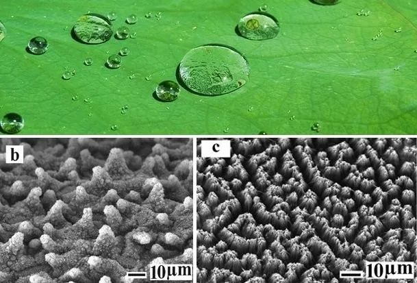 在仔细观察荷叶表面的微观构造后,科学家发现上面密布着微小的突起,突起间充满空气,减少了水滴与荷叶的直接接触,水滴就会圆滚滚地“溜”走了。