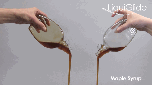用未处理(左)和超疏水处理后(右)的容器倒枫糖浆