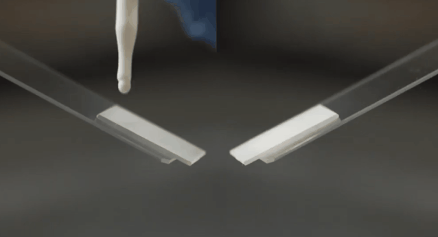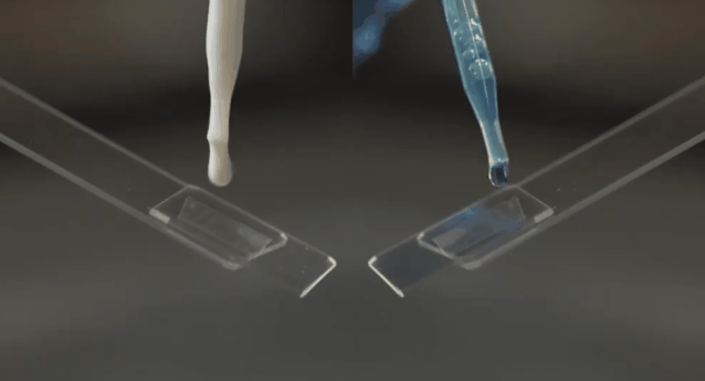 不过上述疏水材料更适用于水基流体,对食用油、芝麻酱这类含油量高的物质,效果就不尽人意了。而洗发水等洗涤用品的主要成分是表面活性剂。表面活性剂分子一头亲水,一头亲油,因此材料还需要兼具疏水性和疏油性才能不被粘上。 我们知道一滴水滴在物体表面还可能形成水珠,但油滴基本都会摊开。这是因为油的表面张力比水小,内聚力不足,容易散在其附着的表面上。表面活性剂的表面张力也比水小得多,而且浸润能力强,想甩开它可不容易。 好消息是,就在几年,俄亥俄州立大学的研究团队已经成功研发出了兼具超疏水性和超疏油性,且稳定耐用的不粘涂层,几乎能够应对所有常见流体,包括难以对付的洗涤剂,先来看看效果。