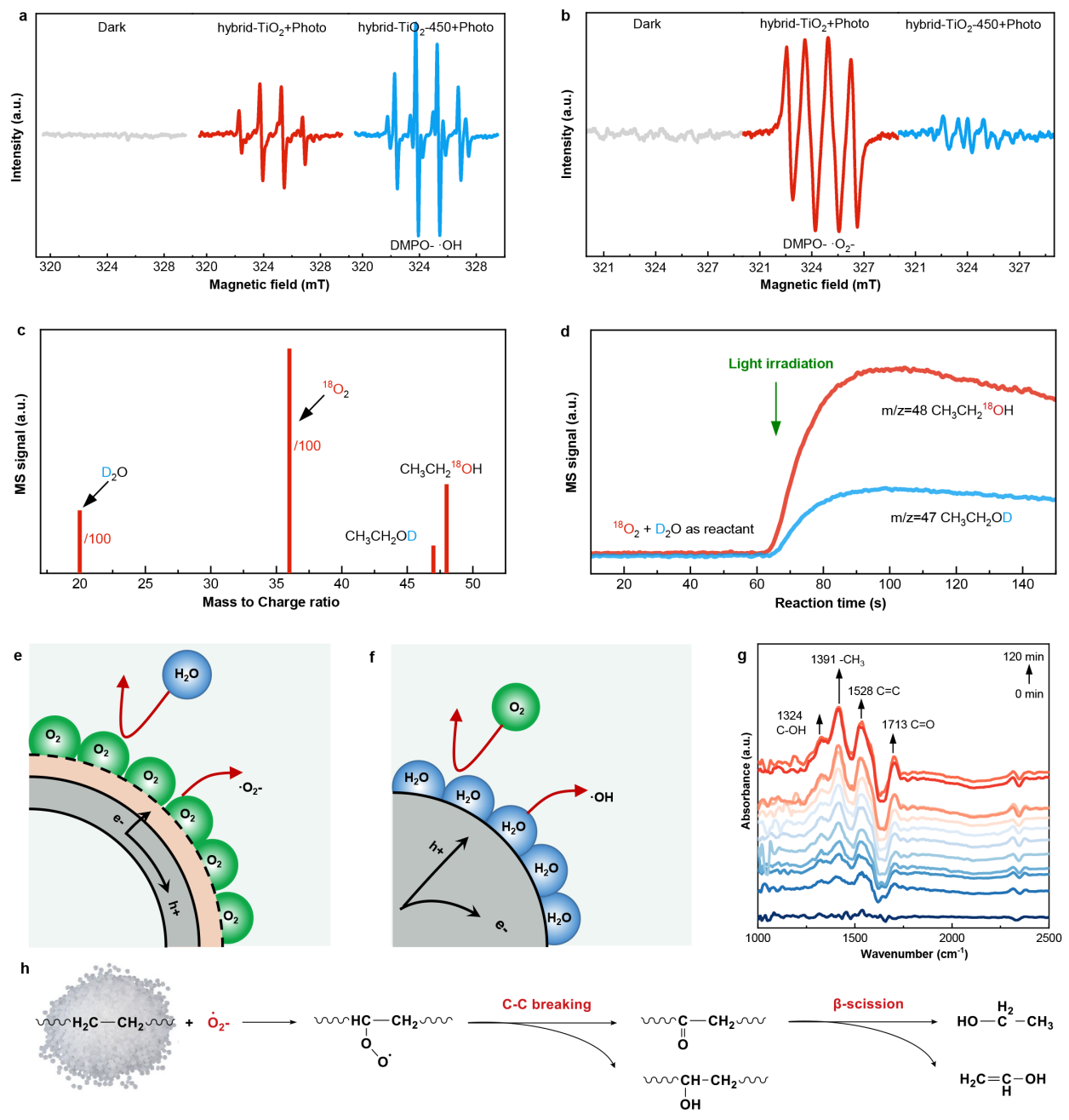 针对上述挑战,中国科学院金属研究所刘岗研究团队另辟蹊径,发展了“漂浮策略”和“维度定制”相结合的新策略,通过在二维TiO₂表面形成纳米级碳氮疏水层,赋予了材料可漂浮于中性水溶液表面的特性。该材料具有传统二氧化钛所不具备的两个功能,一是可漂浮TiO₂材料形成了光催化材料、塑料、水和空气的四相界面,将原本微米级的相界面压缩至近零距离的分子级接触(图1);二是不同于传统的光催化重整材料体系主要是利用由光生空穴氧化水分子产生羟基自由基物种,可漂浮TiO₂材料主要是利用光生电子还原氧气产生超氧自由基作为氧化物种,其寿命长达1ms,传递距离是传统体系中羟基自由基的万倍量级(图2)。进而,所研制的可漂浮TiO₂材料具有优异的光重整塑料性能:在不依赖于腐蚀性溶液预处理的情况下,可实现典型塑料(包括聚乙烯、聚丙烯和聚氯乙烯)的光重整效率1-2个数量级的提升,同时产生选择性超过40%的高值乙醇产物,创造了中性条件下重整效率的新纪录(图3)。为解决塑料转化过程中用腐蚀溶液处理塑料带来的工业成本提供了极具竞争力的替代方案。