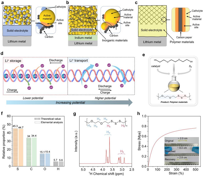 固态锂电池因具有高安全性和高能量密度,被视为下一代储能体系的重要发展方向。在传统固态电池中,“离子传导”与“离子储存”功能分别由电解质和电极材料承担,导致电极/电解质界面阻抗大、离子传输效率低。为解决上述界面难题,中国科学院金属研究所科研人员创新性地在聚合物体系中实现了具有分子尺度界面的一体化电极-电解质材料。在聚合物骨架中,通过共价键方式同时引入了电位调控的快离子传输通道与可逆离子储存位点,实现了离子传导与存储的功能融合,改变了界面存在形态,为提升固态电池电化学性能提供了新方案(图1)。相关研究成果近期以“Potential-gated polymer integrates reversible ion transport and storage for solid-state batteries”为题,发表于Advanced Materials。