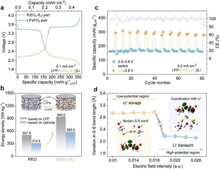 在前期对富硫聚合物电极材料(Adv. Funct. Mater. 2024,34,2405122;Energy Storage Mater. 2022,45,1144;Energy Environ. Sci. 2020,13,1076.)和聚合物固态电解质(Energy Storage Mater. 2025,74,103941;Energy Environ. Sci. 2022,15,3379;Adv. Funct. Mater. 2020,30,2007172.)的研究基础上,团队充分利用了聚合物分子的设计灵活性和界面适应性,在主链上共价引入具有离子传导功能的乙氧基团和氧化还原活性的短硫链,制备出兼具高离子传输能力(离子电导率达1.0 × 10-4 S cm-1,50 °C)与高离子储存功能(放电比容量达491.7 mAh g-1)的分子尺度界面一体化聚合物材料P(EO2-S3)。实验与理论计算表明,P(EO2-S3)的电子结构可随电位发生可逆转变,实现在不同电位区间离子传输与存储行为的可控切换,拓展了其在固态电池中的多样化应用场景。基于P(EO2-S3)构建的一体化柔性电池具有高达20,000次的抗弯折性能和快速的反应动力学。将P(EO2-S3)作为常规正极(如磷酸铁锂)的聚合物电解质时,其氧化还原活性可在特定电位下被激活,从而将正极的能量密度提升86%(图2)。该研究不仅深化了对聚合物中离子传输与存储机制的理解,也为发展高性能一体化电极-电解质材料提供了新的设计思路与研究范式。