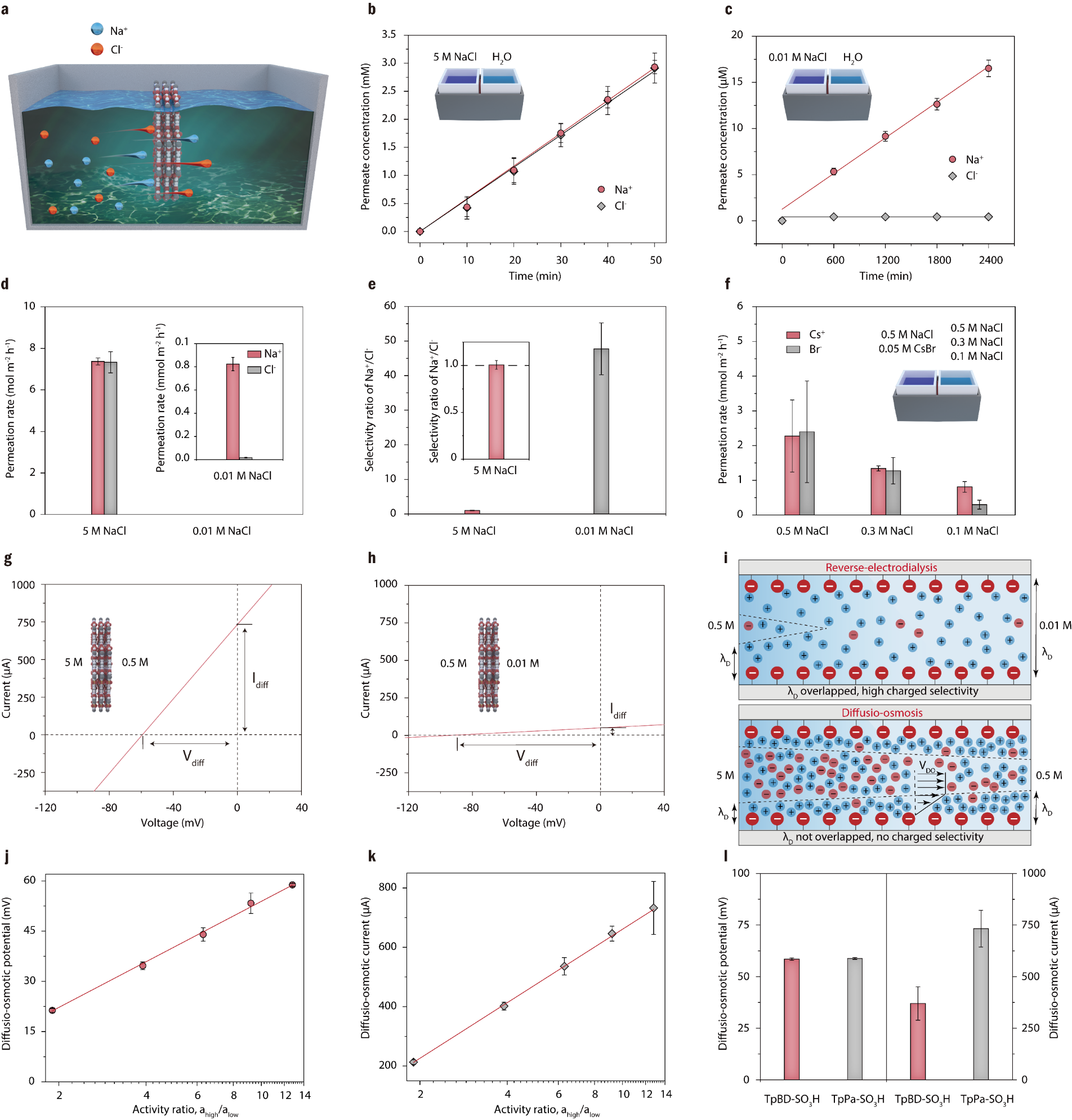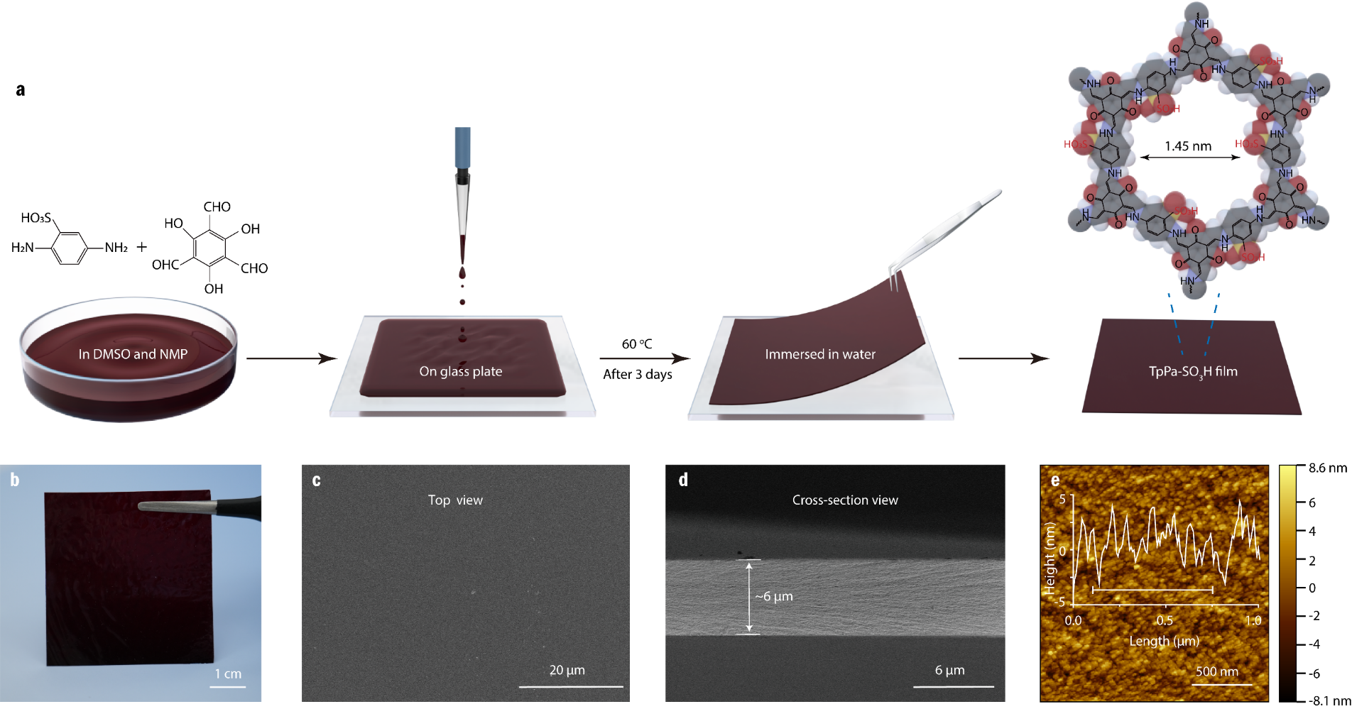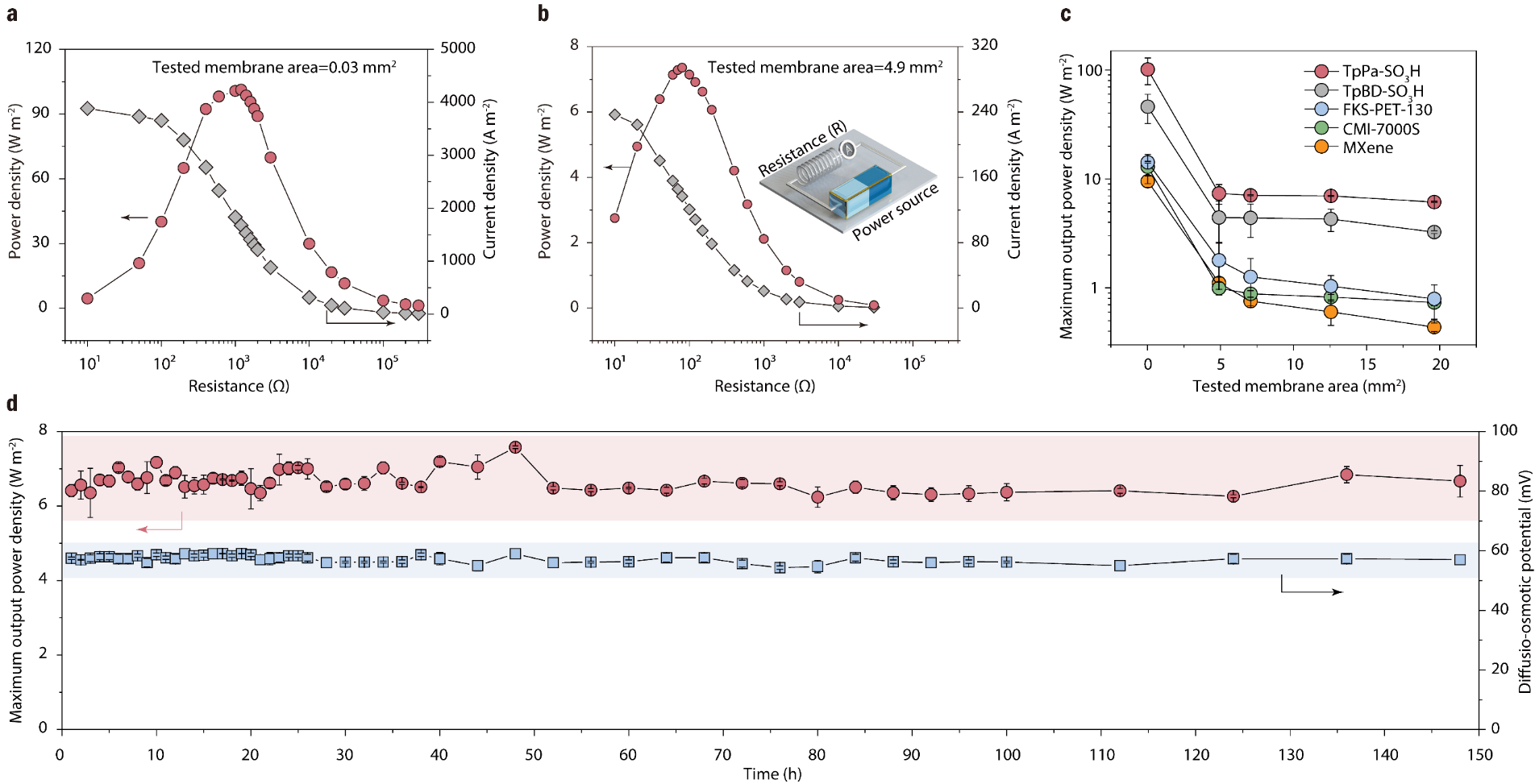 此前,利用单孔氮化硼纳米管、石墨纳米通道的研究已表明该机制有望实现超高功率密度的盐差能转换,但在膜尺度上仍缺乏相关研究。研究团队针对难以找到合适的膜材料匹配该机制开展研究,发现利用磺酸共价有机框架(COF)膜致密分布的磺酸基团、垂直排列的孔道结构,可以实现基于扩散-渗透机制的可规模化盐差发电。