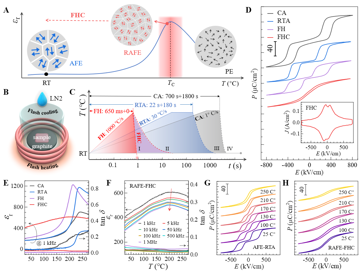 研究结果表明,闪速退火工艺成功地将材料高温顺电相结构冻结至室温,形成了尺寸小于3纳米的短程有序纳米畴,从而诱导出关键的弛豫反铁电行为。此外,该工艺使薄膜晶粒排列更加致密,增加了有益的小角晶界数量,并有效抑制了制备过程中铅元素的挥发,很大程度上消除了铅空位等有害缺陷。上述因素的协同作用,显著降低了薄膜电容器的漏电流,并同步提高了其极化强度与击穿电场,最终将储能密度提升至63.5 J/cm3 。尤为突出的是,利用该工艺制备的薄膜电容器表现出卓越的温度稳定性。经低至零下196 ℃的液氮环境, 到高达400 ℃的高温循环后,其储能密度与效率的衰减均低于3%。这一特性确保了器件可应用于深空探测、地下油气勘探等极端温度环境。该技术兼具普适性与可扩展性。它同样适用于经典的锆钛酸铅 (PZT) 铁电材料,能将其转变为弛豫铁电体从而提升储能性能五倍;更可在2英寸硅晶圆上制备出均匀的弛豫反铁电薄膜,为芯片级集成储能提供了具备工业化潜力的解决方案。