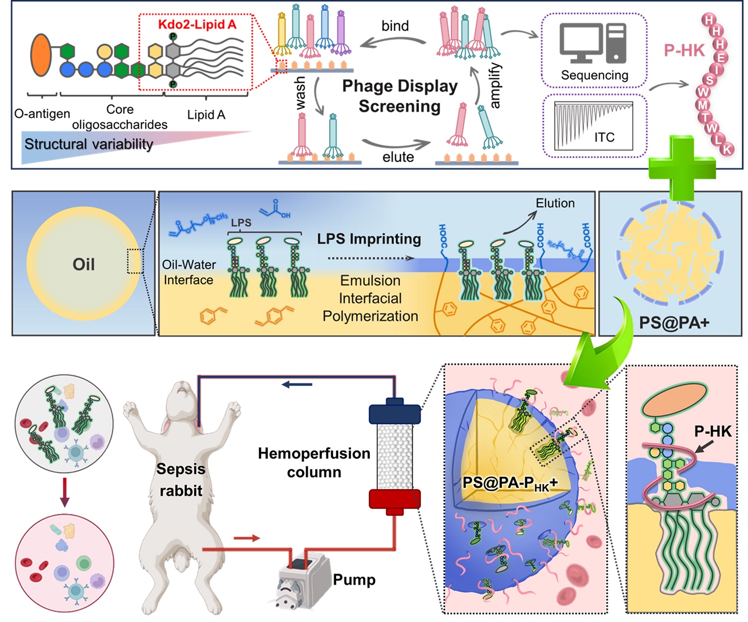 为解决上述难题,研究团队创新性地融合高亲和多肽与分子印迹聚合物技术,开发出新型“双亲和”脂多糖捕获材料。团队首先利用脂多糖的保守结构核心——Kdo₂-Lipid A作为靶标,通过噬菌体展示技术筛选出一种新型高亲和肽(P-HK),该肽对多种细菌来源的脂多糖均表现出较强的结合能力。进一步,团队利用脂多糖的两亲性质,通过乳液界面聚合的方法,构建了表面具有脂多糖精准匹配空腔的印迹聚合物颗粒。最终,团队通过将印迹聚合物与亲和肽偶联,实现了“形状选择性识别”与“肽特异性亲和”的协同增效,形成独特的“双亲和”捕获机制。实验结果显示,该材料在对大肠杆菌脂多糖的清除中,不仅在缓冲液中清除率达到99.2%,在全血环境中也保持了95.4%的高效清除性能,并对多种致病菌脂多糖均表现出广谱清除能力。此外,该材料具备优异的抗蛋白黏附性能和良好的生物相容性,可为血液净化应用提供关键安全保障。在脓毒症兔模型治疗中,基于该材料的血液灌流实现了84.8%的脂多糖清除率,有效缓解了多器官损伤,提升了兔的存活率。该研究有望为脓毒症治疗提供一种精准、高效的技术方案。