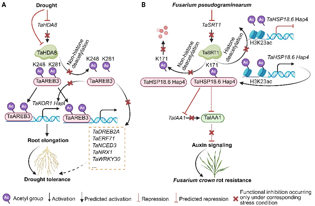 团队以Nonhistone deacetylation: a switch for crop resilience为题发表于Trends in Plant Science的 Spotlight文章指出,组蛋白去乙酰化酶(HDAC)介导的非组蛋白去乙酰化在作物逆境响应中充当重要的分子开关。在小麦中,组蛋白去乙酰化酶TaHDA8通过去乙酰化转录因子TaAREB3抑制根系伸长,从而负调控抗旱性,但干旱胁迫会抑制TaHDA8的蛋白丰度;组蛋白去乙酰化酶TaSRT1通过去乙酰化热激蛋白TaHSP18.6抑制生长素信号,进而负调控镰刀菌冠腐病抗性,而病原侵染同样会降低TaSRT1的蛋白丰度。由此,生物胁迫与非生物胁迫触发的“去乙酰化作用解除”可作为提升作物抗逆性的调控开关,为抗逆育种提供了可模块化利用的新靶点。