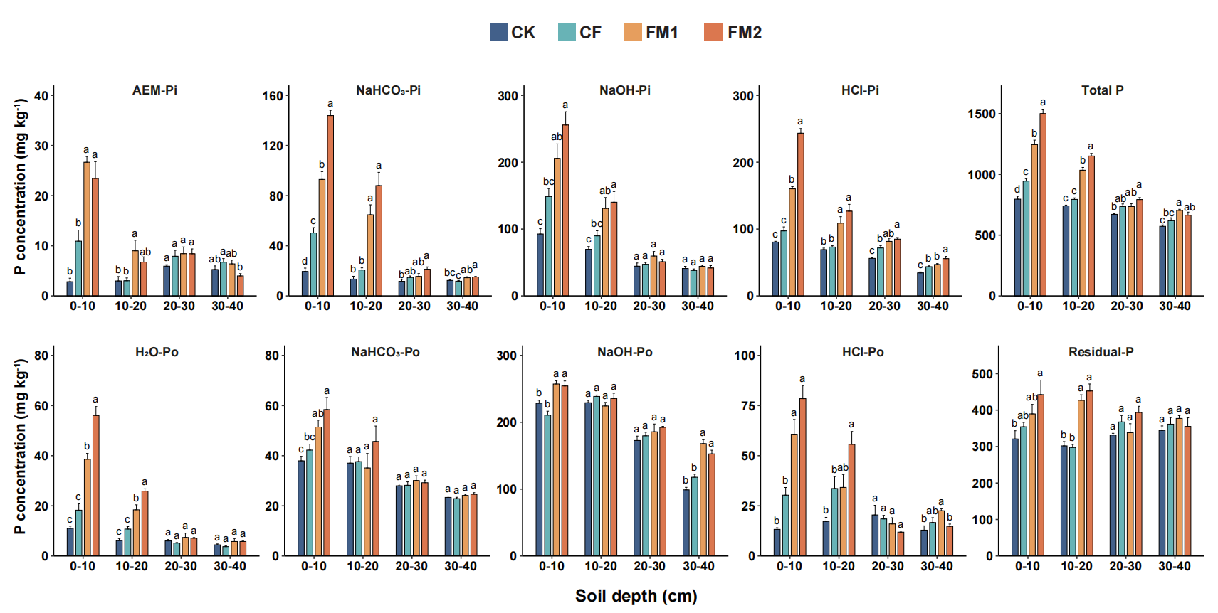 黑土剖面(0-40 cm)不同磷组分含量。不施肥(CK),单施化肥(CF),CF配施15 Mg ha-1牛粪有机肥(FM1),以及CF配施30 Mg ha-1牛粪有机肥(FM2)