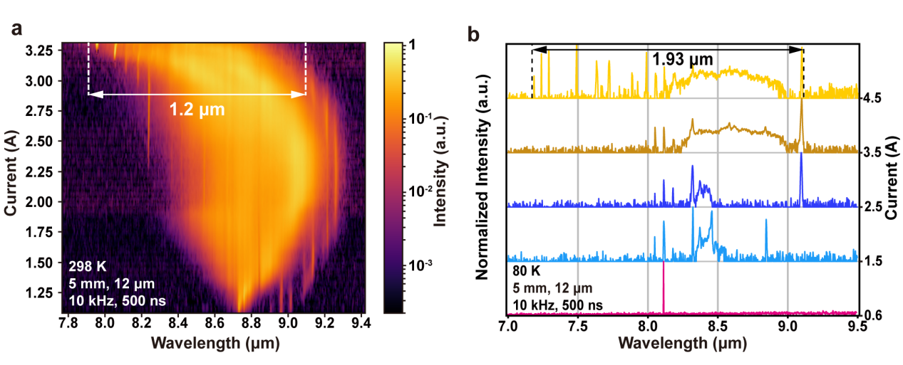 该器件在电流动态范围内不同注入电流下的激光光谱特性如下:在阈值电流附近,器件呈现出窄带激光光谱特性,其中心波长位于8.8 µm。在注入电流增至2.5 A的过程中,光谱宽度随电流升高逐渐展宽,同时中心波长会呈现红移趋势,最终移至9.2µm。进一步增加电流至反转电流时,激光光谱宽度会持续拓宽到1.2 µm,中心波长呈现蓝移现象,最终稳定在8.0 µm。1.2 µm的光谱宽度代表了在室温下单一有源区量子级联激光器在相近波长下所能实现的最宽激光光谱。80 K下同一器件获得1.93 μm激光谱宽。