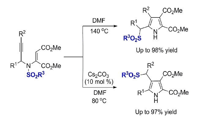 吡咯衍生物是最重要的杂环化合物之一,是许多天然产物、医药、材料的主要结构单元,也是有机合成中重要的中间体。最近,该小组通过设计构建模块,首次发现一种在吡咯合成中磺酰基迁移的现象。磺酰基由反应物的氮原子上选择性地迁移到产物的碳原子上,这种迁移使吡咯产物高度官能化。实现由简单易得的原料出发,不使用过渡金属催化剂、高选择性、高收率、高原子经济性的合成官能化的吡咯衍生物。初步的机理研究表明,反应可能经过不同的联烯中间体和离子对过程。该合成方法的原料廉价易得、操作简单、收率高,有利于大规模放大制备。