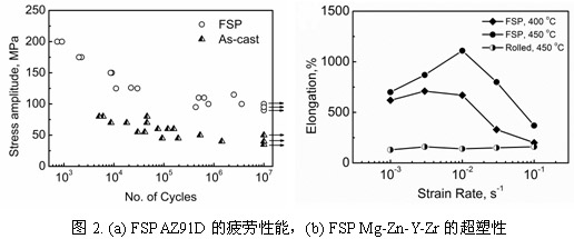 他们对高铝含量的Mg-Al-Zn和稀土镁合金进行了研究,发现FSP能够破碎粗大的铸态组织并导致动态再结晶;破碎粗大的网状第二相粒子并使其大部分溶解;消除孔洞疏松等铸造缺陷。1-2道次的FSP即可实现微观组织重构,把粗大非均质铸造组织转变成细小、均匀、致密的锻造组织(图1)。尤其重要的是,FSP获得的是等轴细晶结构的过饱和固溶体,并且具有高角晶界比率高、织构弱的特点,这是其它塑性加工手段无法实现的。人工时效后,FSP合金中析出弥散的第二相粒子,显著提高了材料的力学性能。例如,对于铸造AZ80镁合金,FSP后的屈服强度、抗拉强度、延伸率较铸态母材分别提高了63%、170%、510%;FSP+时效后,分别提高了130%、194%、315%。对于铸造AZ91D,FSP后疲劳强度从45 MPa提高到105 MP(图2a)。此外,FSP能够实现镁合金铸件的缺陷修复,例如,对于Mg-Nd-Zn-Zr铸件的10mm深缩松区,FSP修复后强度和塑性均高于无缺陷母材。