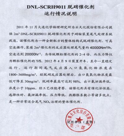 该公司尾气反应器原装填颗粒催化剂,但出口氮氧化物浓度超过国家排放标准,急需进行装置改造。受场地条件限制,在保留原有反应器的条件下,大连化物所进行了塔内件的设计,成功装填2m3整体结构高效SCR脱硝催化剂于原有反应器中。该装置处理尾气量约40000Nm3/h,空速达到20000hr-1,为传统颗粒催化剂的2-4倍。该催化剂是能源环境工程研究组在多年脱硝催化剂开发基础上,为脱除硝酸尾气中氮氧化物而开发的新一代蜂窝陶瓷整体结构催化剂,已申请国际PCT专利,具有自主知识产权。该催化剂具有高空速操作时催化活性高、选择性好、氨泄漏率低、压力降低、更好的抗酸腐蚀能力,热膨胀系数小等诸多优点,是一种非常适合硝酸尾气NOx治理的整体催化剂。