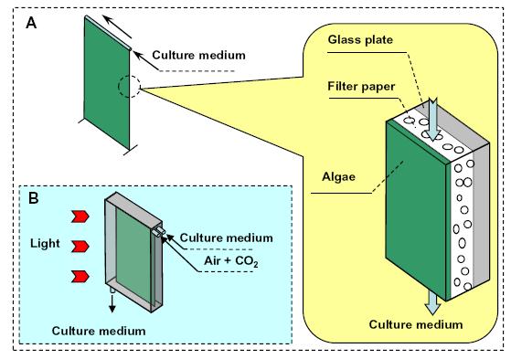 为破解微藻规模培养占地、耗水等难题,该团队负责人刘天中研究员与王俊峰等提出了基于微藻贴壁培养的新方法。此方法将传统悬浮培养的藻细胞贴附于一定的支撑介质上并保持完全润湿,通过调节培养基组成与供气CO2浓度,实现了微藻的贴壁生长和油脂诱导积累。研究证明淡水藻、海水藻、绿藻、硅藻等均能够在贴壁条件下良好生长(中国专利申请号:201010250866.X)。