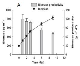 图2. 产油栅藻的贴壁培养产率验证(A:室内,B:室外)