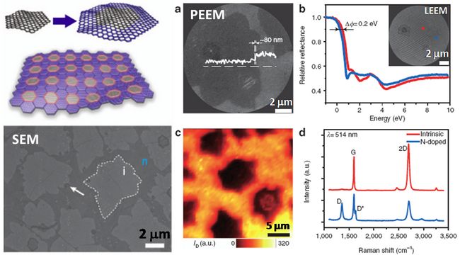 近日,中科院大连化学物理研究所纳米与界面催化研究组(502组)与北京大学化学与分子工程学院刘忠范-彭海琳课题组合作,利用本组新近研制的深紫外激光光电子发射显微镜(DUV-PEEM)和像差矫正低能电子显微镜(AC-LEEM)系统对调制搀杂制备的具有“马赛克”结构石墨烯进行表面形貌和表面功函数研究,证实了利用化学气相沉积法成功地实现了本征石墨烯区域和氮搀杂石墨烯区域的可控生长。该工作最近发表于《自然》子刊《自然-通讯》 (Nature Commun. 2012, 3: 1280; doi: 10.1038/ncomms2286)。