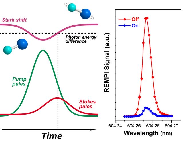 研究振动激发的氢分子反应动力学特性,首要的挑战就是如何高比率地制备处于特定振动激发态的氢分子。传统的红外单光子吸收和受激拉曼技术由于受到自发辐射效应和相干布居返回效应的限制,理论激发比率小于50%,实际能达到的比率更低。研究人员使用自行搭建的一套窄线宽、高脉冲能量的激光系统,利用斯塔克诱导的绝热拉曼通道(SARP, Stark-Induced Adiabatic Raman Passage)技术,成功地将分子束中的HD分子从振动基态(v = 0, J = 0)转移至激发态 (v = 1, J = 0),激发比例超过90%,在实验上首次验证了利用SARP技术,在分子束中制备振动激发的氢及其同位素分子是一种可行的方法。该方法可以推广至其它具有拉曼活性的分子,将为交叉分子束和分子束-表面散射实验研究氢等分子的振动激发对化学反应的影响提供一个独特的工具。