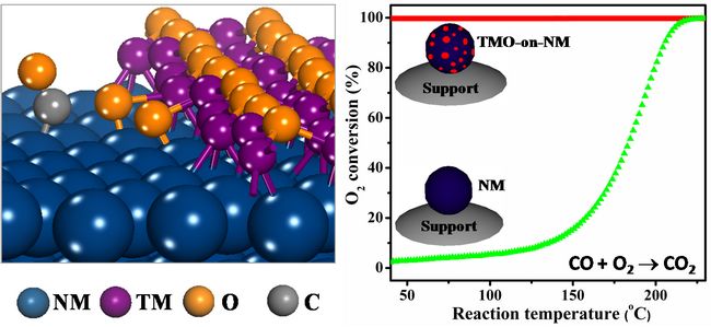 氧化物在多相催化反应中发挥着重要作用,主要被用作催化剂载体来分散纳米金属粒子,同时氧化物能够通过金属-载体的强相互作用(SMSI)强烈地影响金属的催化性能。催化基础国家重点实验室纳米与界面催化研究组将基于模型体系的表面催化研究和真实催化材料中的界面催化研究相结合,创新性地在金属表面构建纳米结构氧化物形成“Oxide-on-metal”反转催化体系,实现担载的纳米氧化物直接催化表面反应。由于氧化物与金属之间的相互作用,在金属表面上形成的氧化物为单层分散、亚稳态结构,在氧化物-金属边界处形成了配位不饱和的过渡金属阳离子活性中心,能够高效活化O2、H2O等分子,成功地用于低温催化氧化等反应,并由此发展出“界面限域催化”的概念。