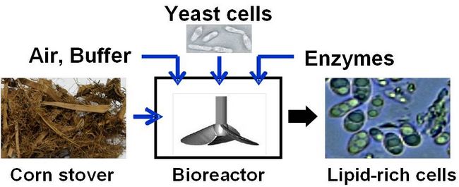 将木质纤维素资源转化为油脂及液体生物燃料,对节能减排和社会经济可持续发展具有重要战略意义,但目前尚面临原料利用率低、转化过程复杂、效率低等共性关键问题。中科院大连化学物理研究所赵宗保研究团队以生物质制油脂和生物柴油为目标,开展了系统研究,最近在生物能源领域重要学术刊物Biotechnology for Biofuels上发表了一种同步糖化强化油脂发酵(simultaneous saccharification and enhanced lipid production)的新策略。该策略利用纤维素或处理过的生物质原料、水解酶和足量产油酵母的混合体系,直接将纤维质原料转化为油脂。利用纤维素和处理过的玉米秸秆为原料时,油脂质量得率分别达到20.4%和11.2%,在摇瓶培养条件下油脂生产强度达到0.13 g/l/h。该微生物油脂主要包含碳链长度为16和18的脂肪酸,适合用于制造生物柴油及相关油脂化工产品。