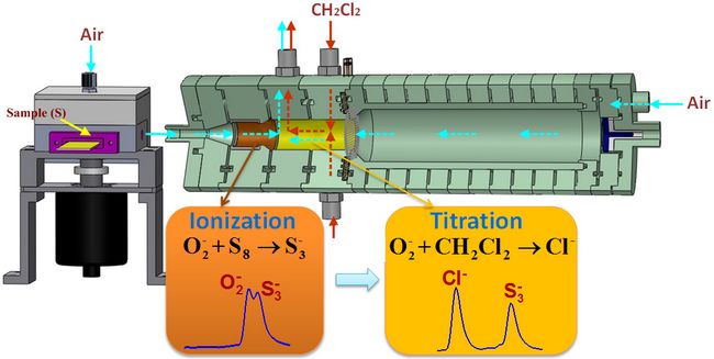 离子迁移谱具有结构简单、灵敏度高、分析速度快等特点,是目前现场检测爆炸物的主流技术,已被广泛应用于机场、场馆的安检。而迄今商品化的IMS对以黑火药为代表的“土”制炸药却无能为力。基于多年对离子迁移谱原理的深入研究,李海洋研究员等提出了控制不同区域离子反应的研究方法,在传统迁移管的电离反应区和迁移区之间设计离子滴定区(TR-IMS),使得S被O2-离子在电离反应区高效电离;而残余的O2-离子在滴定区内与二氯甲烷反应形成Cl-离子,避免了O2-离子与对S产物离子的重叠,提高了选择性和检测灵敏度。实验结果表明:TR-IMS不仅成功实现了S的高选择性检测,而且通过抑制滴定剂对黑火药电离的负面效应,提高了检测灵敏度,S的测量检出限达到5 pg,从而将黑火药、爆竹的检出限提高了6个数量级。同时,TR-IMS也适用于常用的军用硝基爆炸物(硝铵、梯恩梯、太安)的高灵敏检测。
