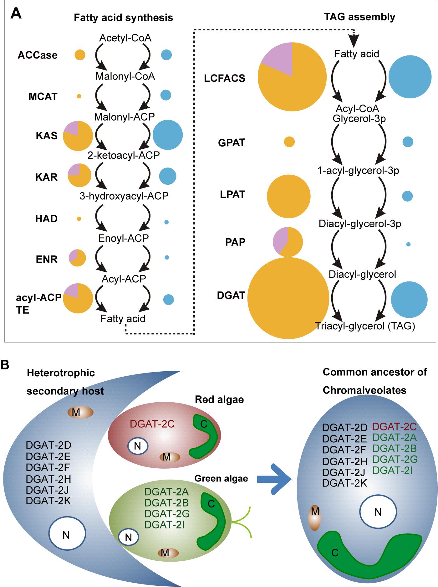 图1. 微拟球藻中TAG合成途径上的基因数膨胀以及其进化来源。