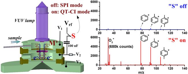 研究人员利用真空紫外光的光电效应,真空紫外光照射在金属电极上产生光电子,利用电场调制光电子的能量使其电离氧气得到试剂离子O2+,利用O2+与样品进行电荷转移反应电离样品得到化学电离源,在电离源中施加射频场,射频场作用下离子运动路径更长,大幅增加了试剂离子与样品的碰撞几率,提高了分子离子反应效率,从而得到更高电离效率。实验结果表明,与单光子电离方式相比,对13种分析物(包括芳香烃,氯代烃,硫化氢等)的检测灵敏度提高了12-118倍。并且,以O2+作为试剂离子,实现了电离能高于10.6 eV的有机物的分析,如丙烷、1,2-二氯乙烷、氯仿等多氯烷烃。